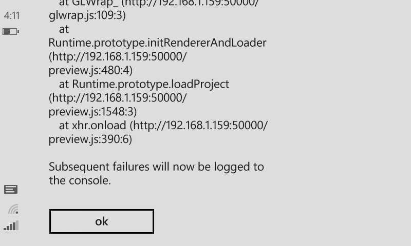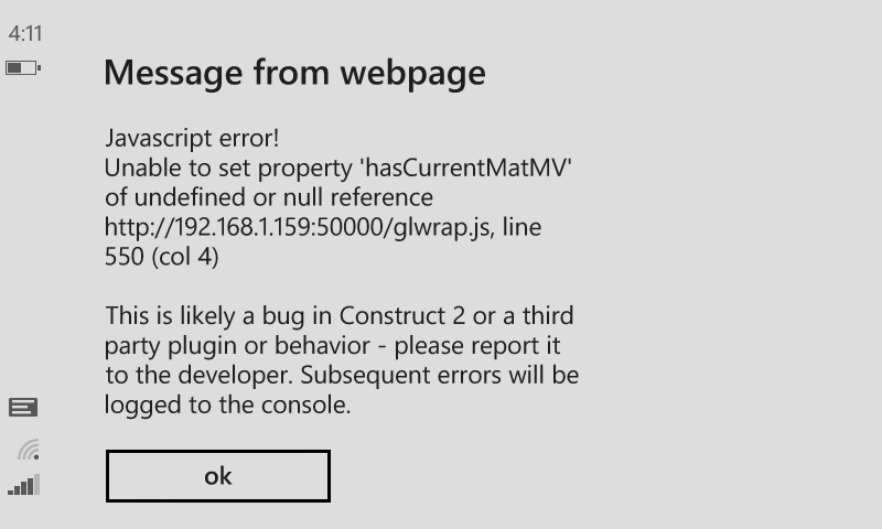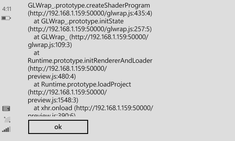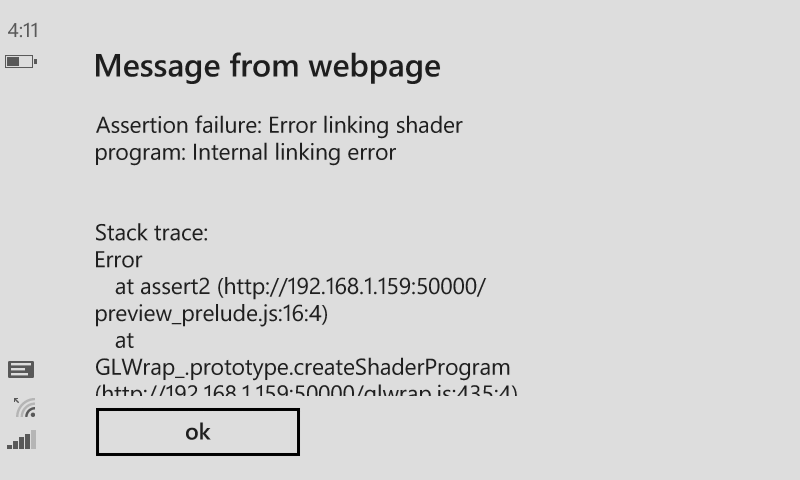 When adding an HSL shader effect on Windows Phone 8.1 it causes the engine to crash upon startup. It doesn't matter if the effect is on a layer or on an individual sprite. This error did not occur on Windows phone 8.0 since effects via WebGL were not supported