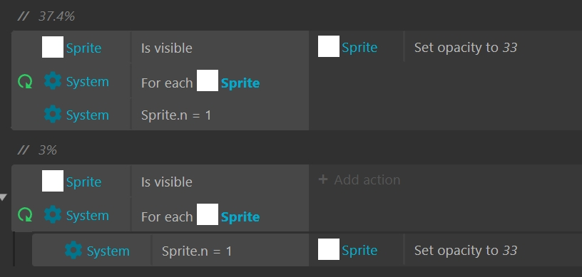 DummyFunction: Pick Sprite by UID , Pick Sprite Child , Set child opacity to 55