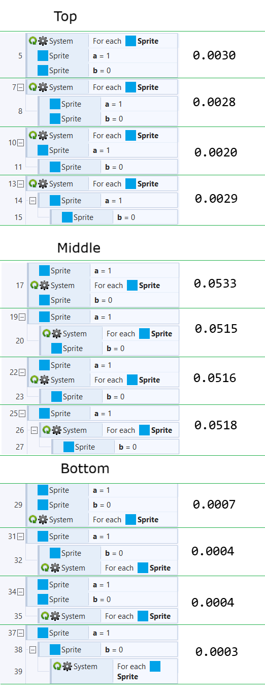 Notably, the higher your CPU speed, the harder it is to observe a CPU difference between two tests. No use fluffing up both tests with a "For" loop, as CPU will just boost its speed and further decrease the CPU difference. If you had an imaginary 100GHz CPU, none of our measurements would even show a 0.1% difference and we wouldn't know there was a difference that could affect the average player with a 2.5GHz CPU. (Always test on lower-powered devices if you aim to target them).