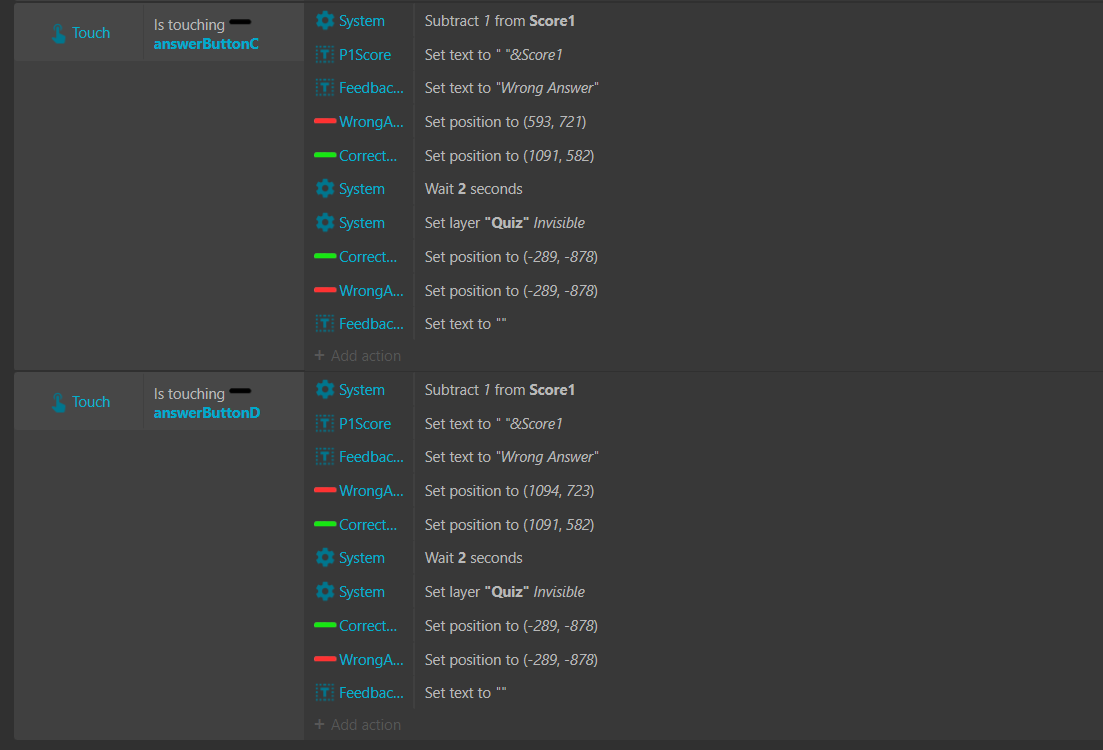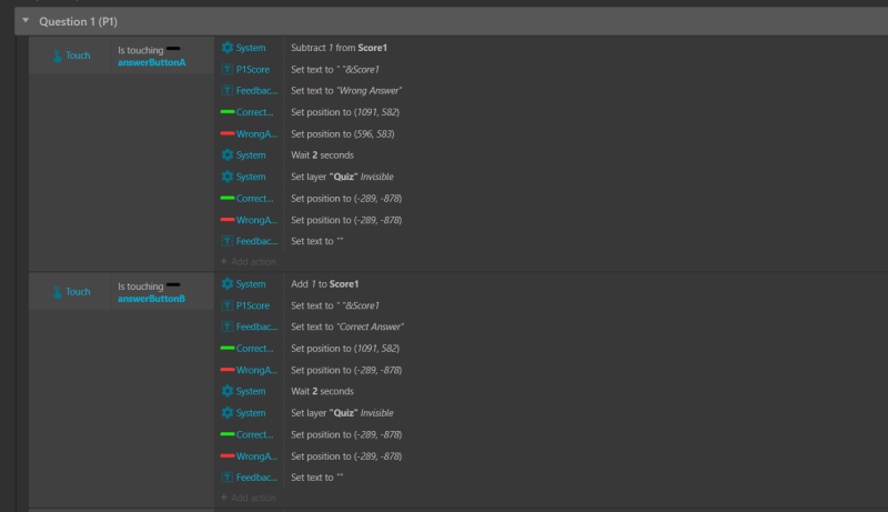 I currently creating a snake and ladder game with an extra feature which is a quiz. So whenever player 1 or 2 is at either the bottom of the ladder or the head of the snake it will pop out a quiz layer and if the player gets the answer correct it will get a score if not it will deduct the score.