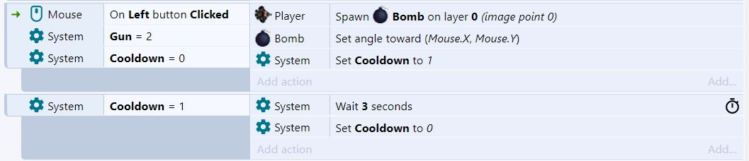 I am fairly new to construct, I was wondering if anyone could help me out with this. I followed the beginners tutorial for the ghost shooter game and have added in two new weapons. You change weapons when you press space. It adds a number to a variable that resets after it gets to 2. The regular gun is 0, flamethrower is 1 and bomb is 2. The bomb is fairly overpowered so far, so I tried to put a cooldown on it by using a variable that gets added to when the bomb is used. Another event senses when the variable is added to, waits 3 seconds, then minuses the number from the variable, setting it back to 0. It works once at the start, then allows the player to throw bombs without a cooldown. I will attach a picture to this thread message thing, can someone please tell me what I'm doing wrong?