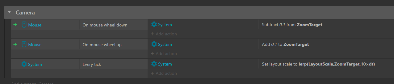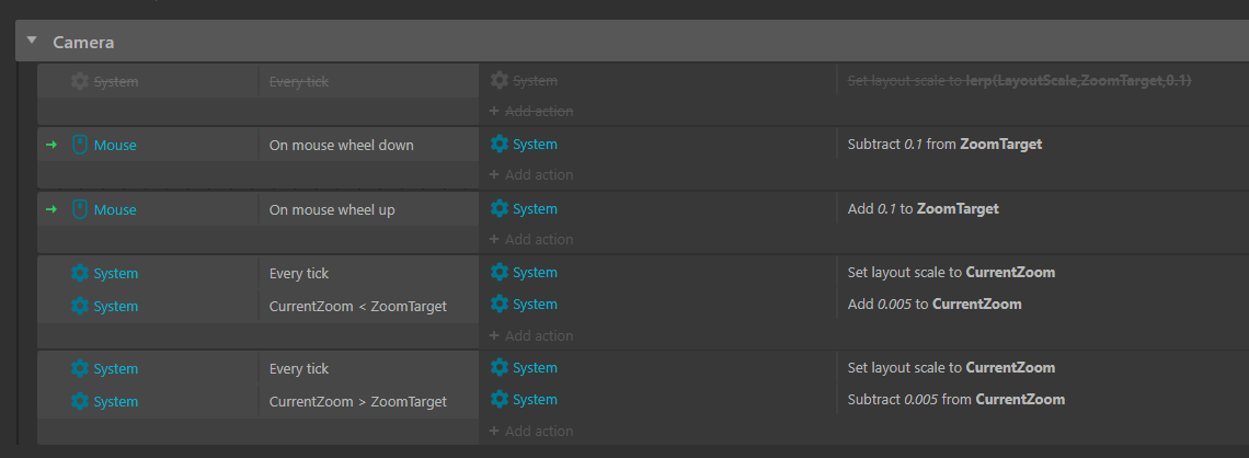 Remove last two events and use this one: On Every tick: Set layout scale to lerp(layoutScale, ZoomTarget, 10*dt) You can try other values instead of 10 to make it faster/slower.