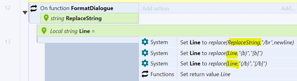 {"is-c3-clipboard-data":true,"type":"events","items":[{"eventType":"variable","name":"REGEX_VARIABLE","type":"string","initialValue":"\\{(\\S+)\\}","comment":"{gold}","isStatic":true,"isConstant":true},{"functionName":"ParseFormat","functionDescription":"","functionCategory":"","functionReturnType":"string","functionIsAsync":false,"functionParameters":[{"name":"source","type":"string","initialValue":"","comment":""}],"eventType":"function-block","conditions":[],"actions":[],"children":[{"eventType":"variable","name":"parseText","type":"string","initialValue":"","comment":"","isStatic":false,"isConstant":false},{"eventType":"block","conditions":[{"id":"test-regex","objectClass":"System","parameters":{"string":"source","regex":"REGEX_VARIABLE","flags":"\"\""}}],"actions":[{"id":"set-eventvar-value","objectClass":"System","parameters":{"variable":"parseText","value":"source"}}],"children":[{"eventType":"block","conditions":[{"id":"for","objectClass":"System","parameters":{"name":"\"\"","start-index":"0","end-index":"RegexMatchCount(source, REGEX_VARIABLE, \"g\") - 1"}}],"actions":[],"children":[{"eventType":"variable","name":"MatchKey","type":"string","initialValue":"","comment":"","isStatic":false,"isConstant":false},{"eventType":"variable","name":"MatchValue","type":"string","initialValue":"","comment":"","isStatic":false,"isConstant":false},{"eventType":"block","conditions":[],"actions":[{"id":"set-eventvar-value","objectClass":"System","parameters":{"variable":"MatchKey","value":"RegexMatchAt(source, REGEX_VARIABLE, \"g\", loopindex)"}},{"id":"set-eventvar-value","objectClass":"System","parameters":{"variable":"MatchValue","value":"Dictionary.Get(mid(MatchKey, 1, len(MatchKey)-2))"}},{"id":"set-eventvar-value","objectClass":"System","parameters":{"variable":"parseText","value":"RegexReplace(ParseText, REGEX_VARIABLE, \"\", MatchValue)"}}]}]},{"eventType":"block","conditions":[],"actions":[{"id":"set-function-return-value","objectClass":"Functions","parameters":{"value":"parseText"}}]}]},{"eventType":"block","conditions":[{"id":"else","objectClass":"System"}],"actions":[{"id":"set-function-return-value","objectClass":"Functions","parameters":{"value":"source"}}]}]}]}