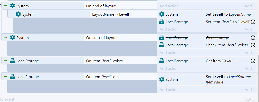 The above is local storage codes.The layout names are [1,2,3...] numbers. so at end of each layout it gets update. The first level works. But, when going to second level. The "levell" variable sets to "Nan" and restart the same coming.