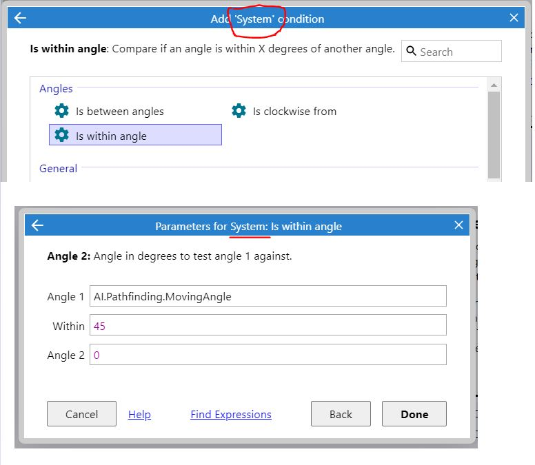 "System AI.Pathfinding.MovingAngle" the closest I could find was "is within angle".