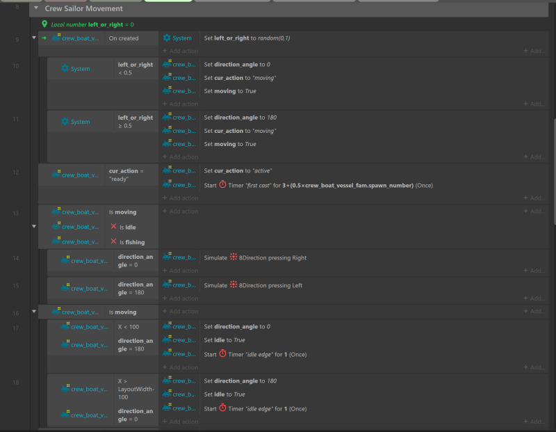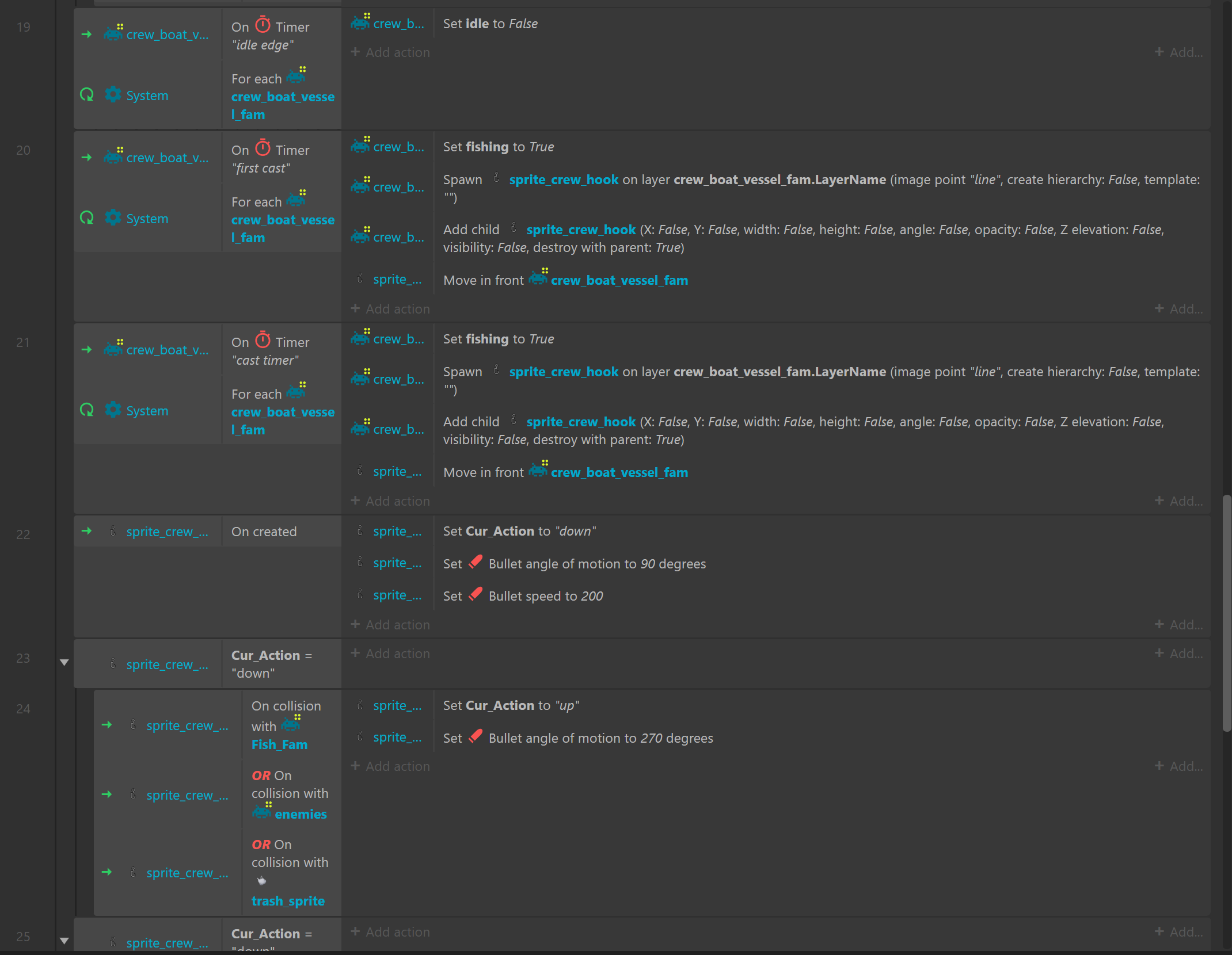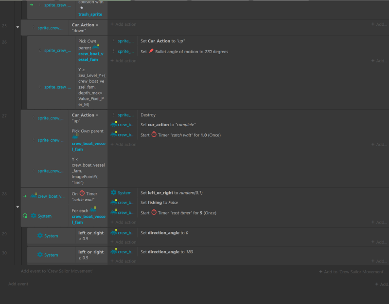 I've figured out the issue! For event 27 I added "For each sprite_crew_hook" and it works correctly now. I guess without that detail it was attributing random hooks and their "crew_boat_vessel_fam" parents.