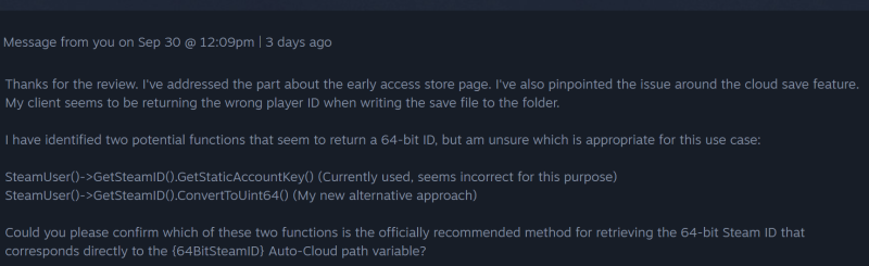also returns a uint64 and its description says "Converts the static parts of a steam ID to a 64-bit representation." So it looks like there are two methods that could be a 64-bit Steam ID. I don't know which is the right one and I don't want to just change the existing implementation without knowing why, especially as that may be a breaking change. So please ask Valve to clear up the confusion!