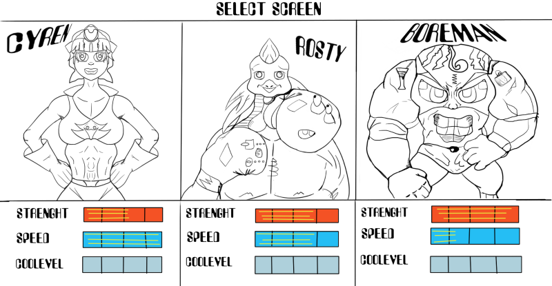 GAME OUTLINE: The game is a 2d Rpg sidescroller beat em up. The single player, or two player in local coop may take control of one of the three fighters. "Boreman" the wrestler , "Rosty" the cockerel, or the agent ,Cyren”. Each level has a boss to defeat. With the points earned by defeating enemies you can unlock alternative costumes, special moves and Bosses to play the hard mode with alternative routes. There could be also minigames in the capital of mars if a player/s dont wanna do a main quest.For example an hairdresser and a mexican bar, where you can play a card game or dance one. Other bizzarre fighters could be unlocked with points or trought DLCs ( a samurai mummy or other character). The goal of the superheroes is to defeat Eviltoyl who wants to find the source that caused the transformation of the superheroes. His goal is to create a new order with him absolute ruler. Months passed and Rosty has become a professionale boxer.The superheroes meet without wanting it after the boxing match won by Rosty and they defeat a gang of snatchers together. They are called after being Hypnotized in the presence of the council of the wize men of the capital that gives them the task of stopping Eviltoyl's plans.