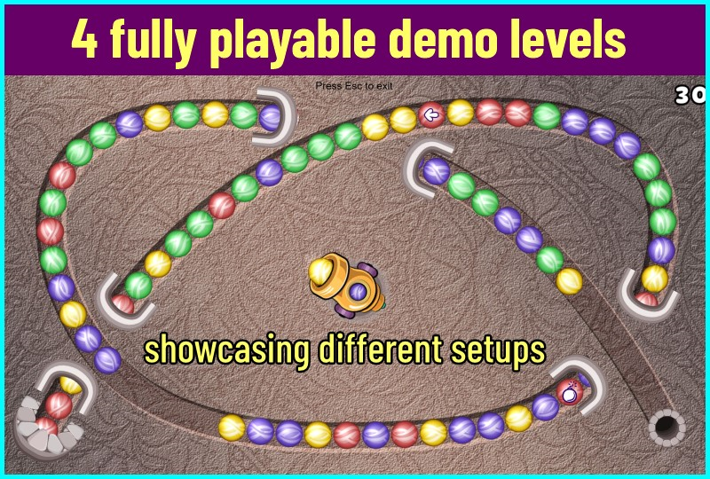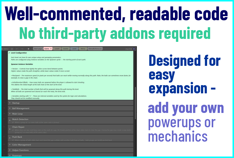 This template includes all core mechanics - rolling ball chains, curved paths, color matching, powerups, scoring, and more - easily customizable and expandable.
