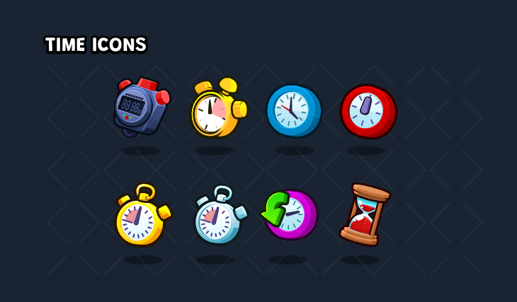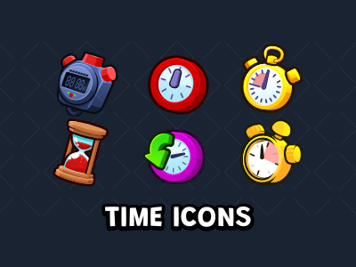 Use these GUI icons for your game timers and menus. These timer icons include classic clocks and hourglass and digital timers. These high quality icons come in SVG , png and GDS format.