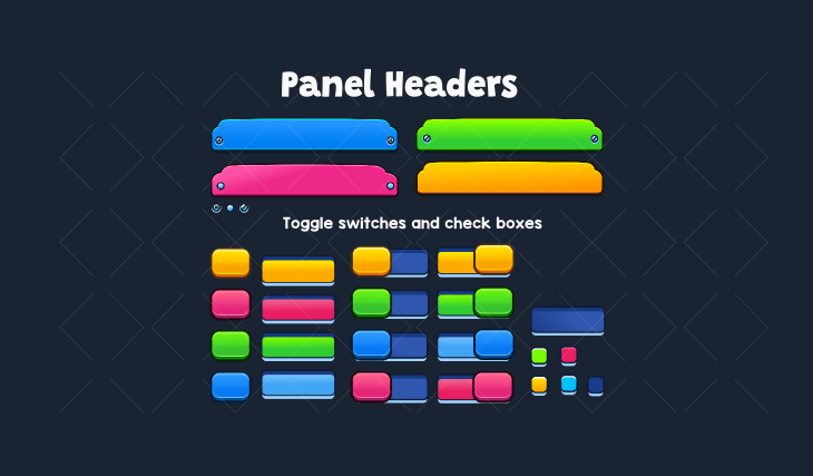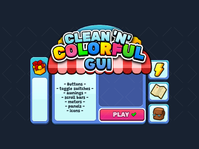Complete clean and colourful game user interface design kit with a crisp popping colourful finish