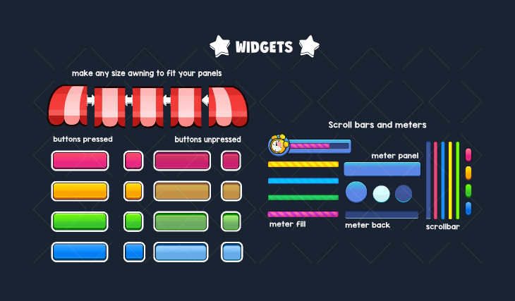 This game GUI design kit includes all you need to craft an application-wide game user interface. This kit is designed to be as extensible as possible allowing you to craft a unique Game User interface to suit your individual specifications. The kit includes pre-made panels which fit most screens and use cases but also stretch well. The kit includes a complete set of useful coloured icons as well as a pack of flat white icons.