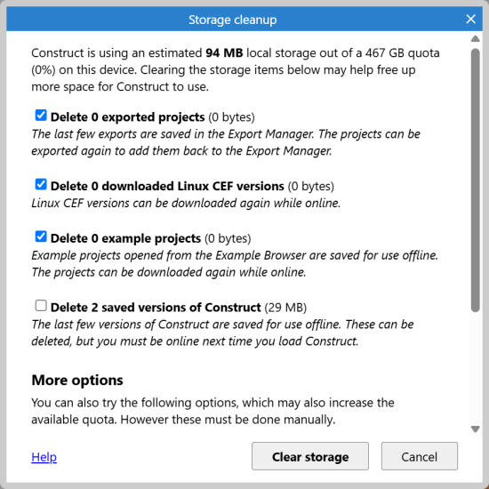 The Storage Cleanup dialog is a tool that helps you to free up storage space on the local device. If you run out of available storage space, it can cause errors to appear and may stop some features of Construct working correctly. This tool provides a way to help solve the problem if that happens. In some cases Construct will recommend you use this dialog to free up more space if it detects a storage problem that may have been caused by lack of free space.