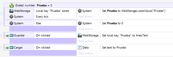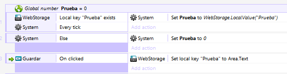 Acción 1: System >> Set value[Prueba, WebStorage.LocalValue("Prueba")] (Entonces pasaria la variable "Prueba" almacenada en el WebStorage a la variable Prueba del juego)