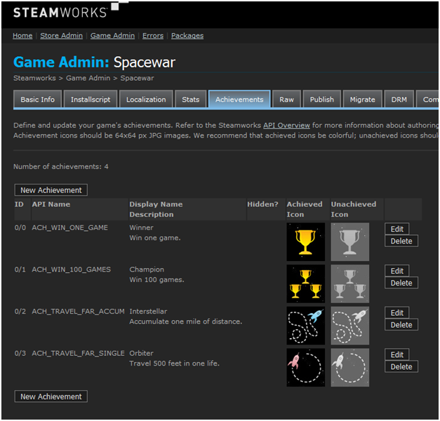 Check Steam docs for more info on setting up achievements - including screenshots like the above using their Steamworks Example Game.