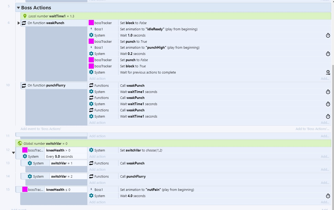 In this example, every... frame, I guess... This condition on the bottom is tested. In all other cases, switchVar 1 or 2 will end up being called. If the bottom condition, kneeHealth <= 0 becomes true however, this does not result in the above actions being canceled. They occur concurrently. How do I stop that from happening?