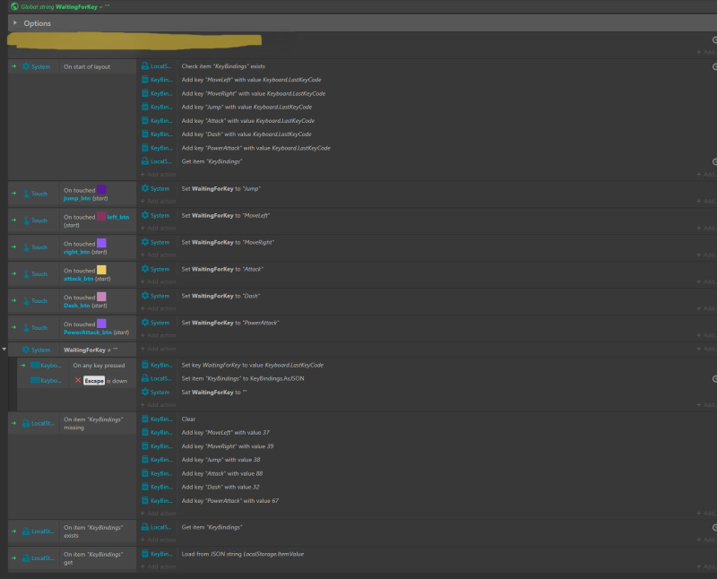 • Hello everyone, I created a key binding section for my game like the one in the picture. The assigned keys work fine in the game. The problem is that I can assign the same key to another action. When that happens, both actions become inactive. By the way, I don’t have much coding knowledge. What’s a simple way to prevent this? I’d really appreciate your help.